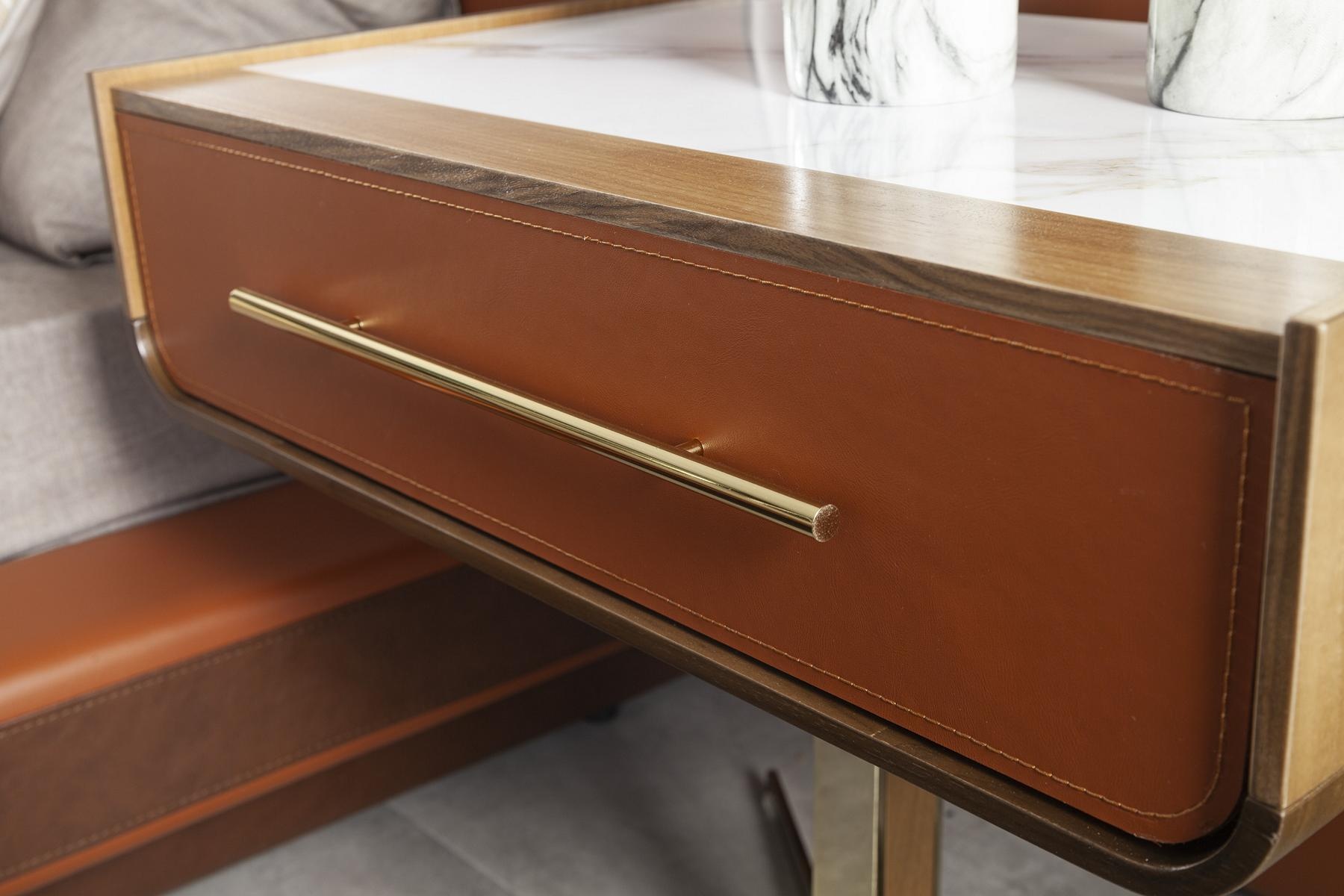 O Conjunto de cama laranja em camadas, acompanhado por duas mesas de cabeceira móveis, é a definição de sofisticação e conforto. Com um design que reflete a maestria artesanal, cada peça exala elegância e modernidade. O tom marrom profundo, combinado com a riqueza das texturas, cria uma atmosfera acolhedora e requintada em seu quarto.