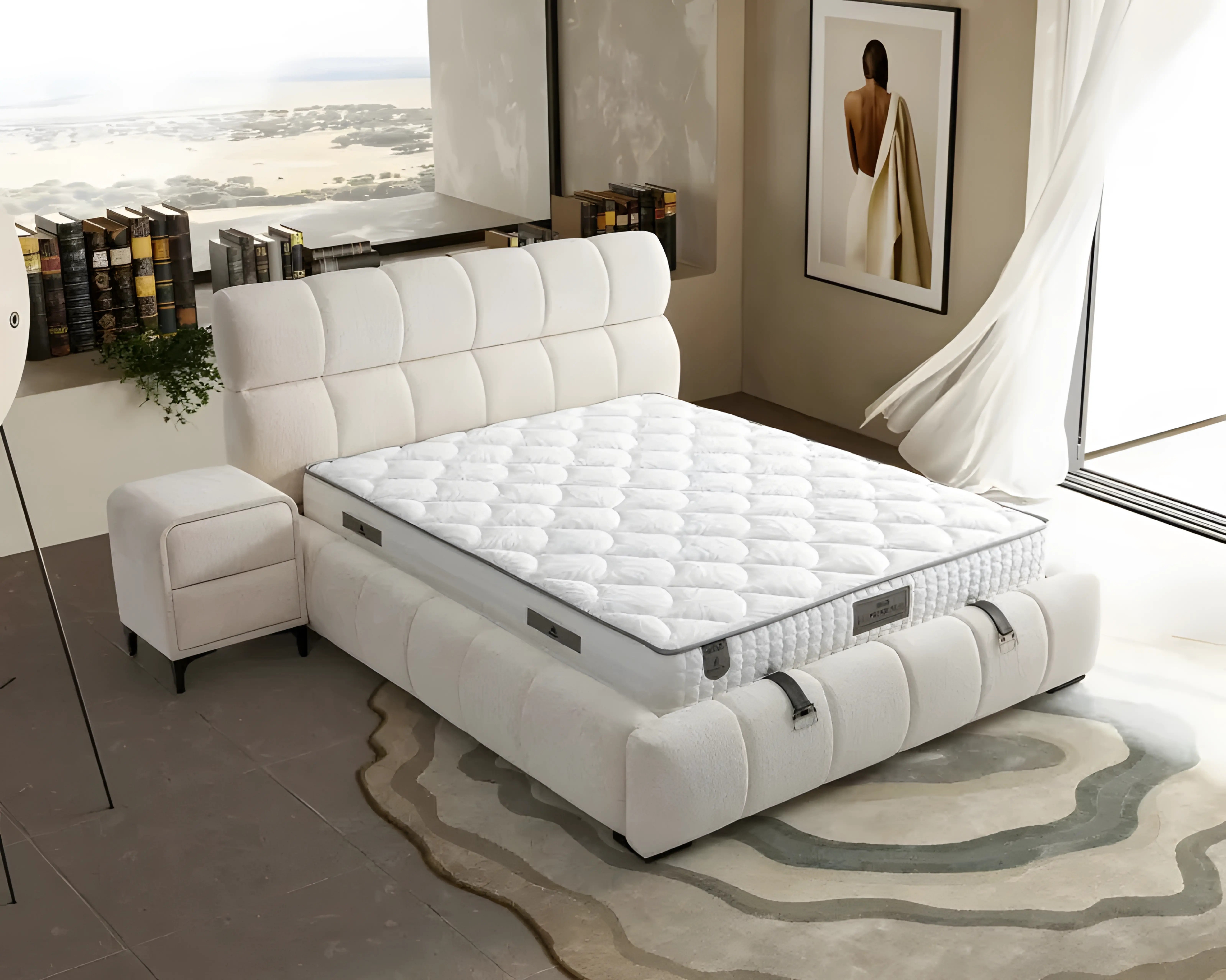 A elegante cama de tecido azul e madeira com colchão é a epitome do requinte e conforto. Seu design sofisticado combina a suavidade do tecido com a robustez da madeira em um tom branco imaculado, criando uma peça que transcende o tempo e a moda. Ideal para quem busca um ambiente exclusivo, esta cama não é apenas um móvel, mas uma declaração de estilo que reflete um modo de vida distinto. O colchão de alta qualidade proporciona um descanso incomparável, enquanto a estética refinada eleva qualquer espaço, tornando-o um verdadeiro santuário de tranquilidade. Escolha esta cama e transforme seu lar em um oásis de elegância e conforto.
