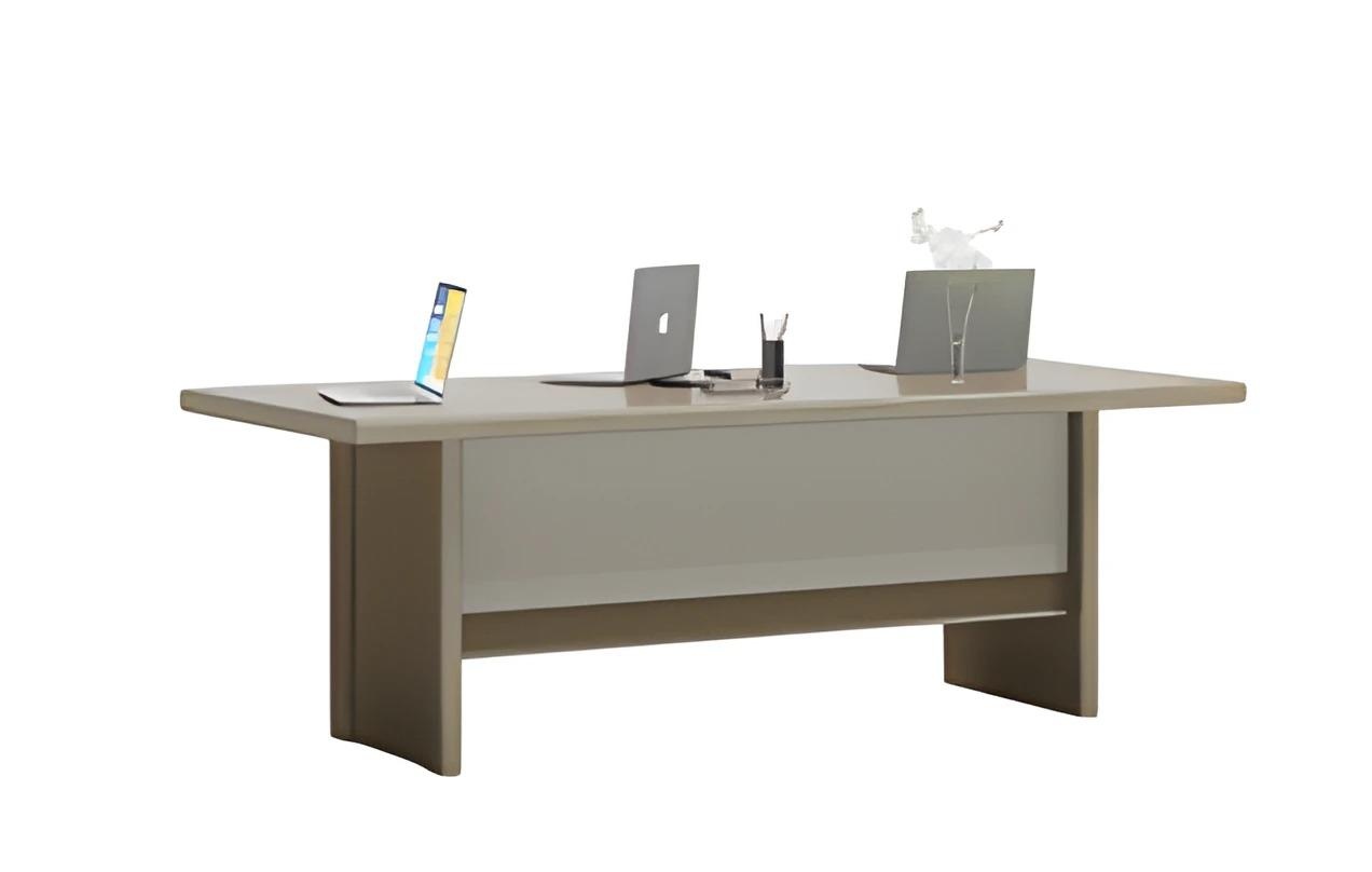 Mesa de café elegante cinza e bege com grande superfície de trabalho