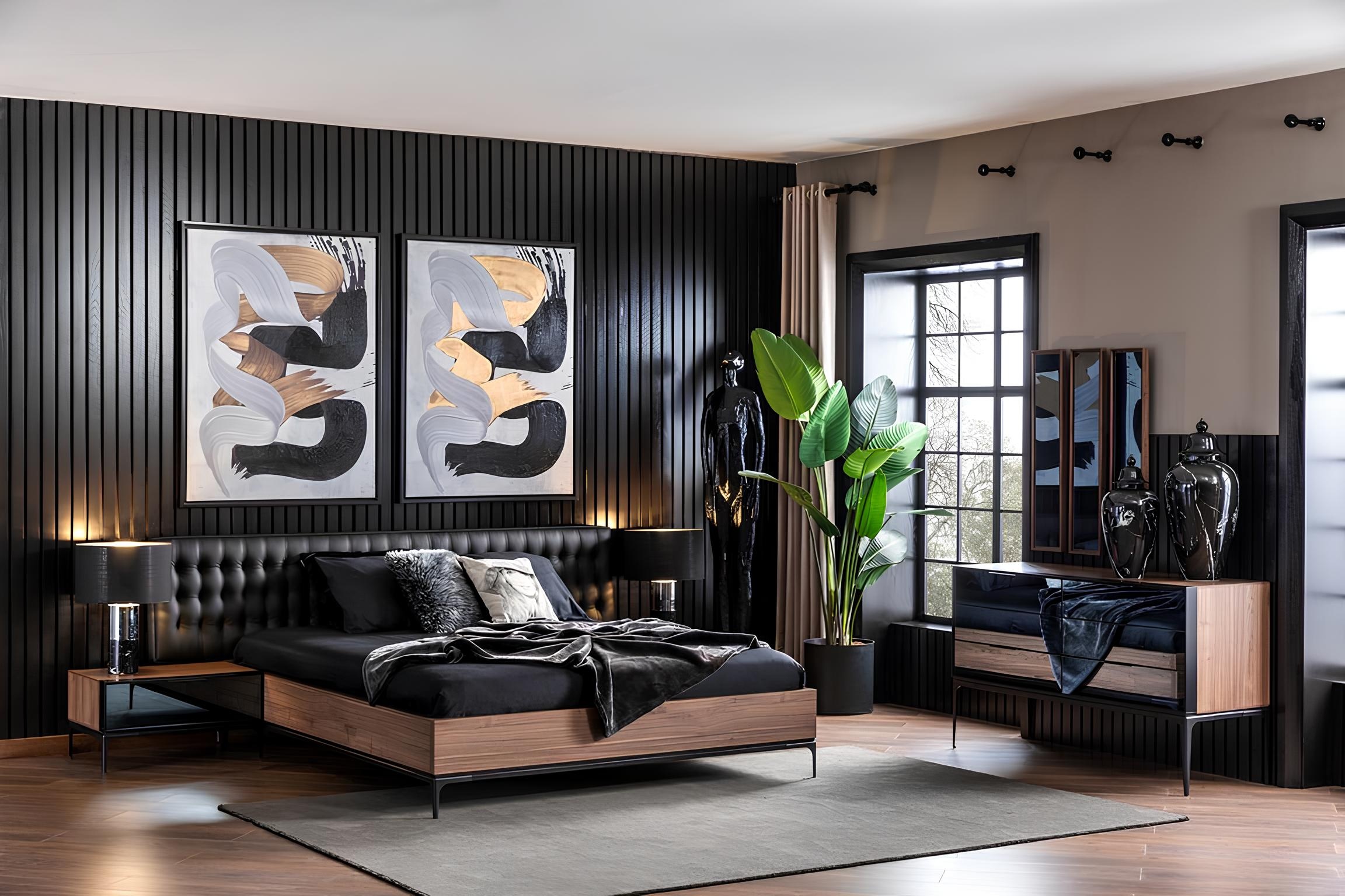 Conjunto de móveis de quarto Perfect set com cama preta e mesas de cabeceira, 8 peças.