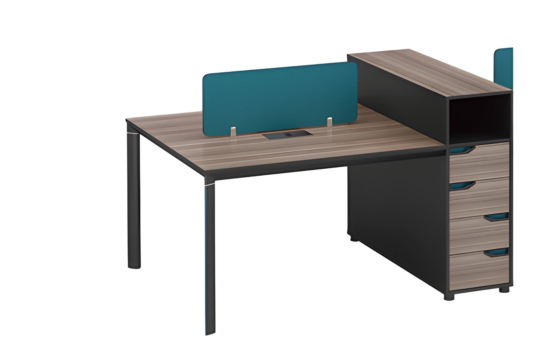 Mesa de escritório moderna com espaço de armazenamento, painel divisório e aparência de madeira